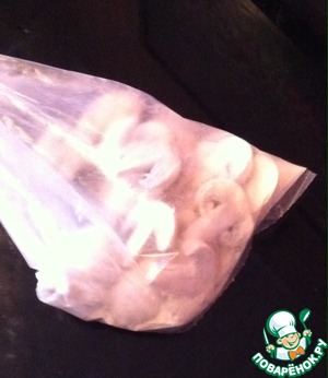 Слегка смачиваем их водой и отправляем в пакет с мукой и солью, встряхиваем.