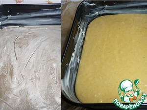 Дно формы (24х24) застелить пекарской бумагой, смазать маслом и заполнить тестом.