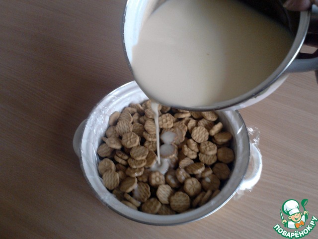 Форму выстилаем пищевой пленкой, насыпаем печенье (если крупное - поломать) вперемешку с шоколадными шариками на 2/3 высоты ( я в этот раз не перемешивала, насыпала слой шариков, затем печенье)