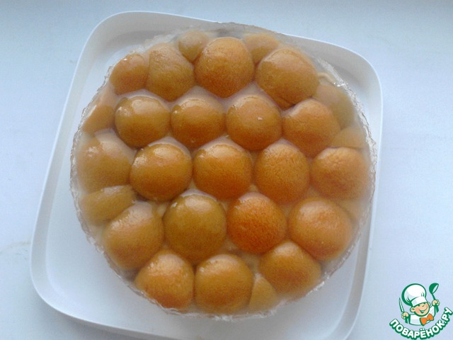 Затем выкладываем абрикосы, сироп от них смешиваем с остатками желатина (если застыл-можно снова нагреть), заливаем и вновь убираем в холодильник до окончательного застывания (я обычно ставлю на ночь).