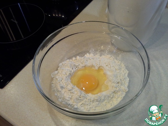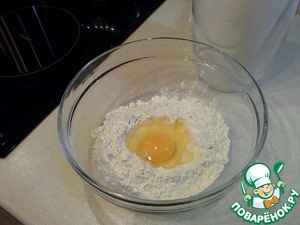 А пока бульончик варится, приготовим домашнюю лапшу. Для этого высыпаем в миску муку горкой и в лунку вливаем яйцо, солим и вилочкой начинаем аккуратно замешивать тесто. Немного погодя доливаем пол стакана теплой кипяченой воды и продолжаем замешивать.