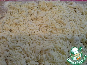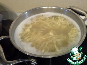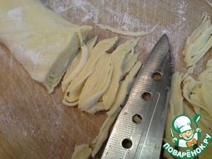 Нарезанную лапшу обильно присыпаем мукой и как бы растираем легко между ладонями - так все лапшинки разъединятся. Оставляем лапшу на некоторое время, пусть она немного подсохнет.