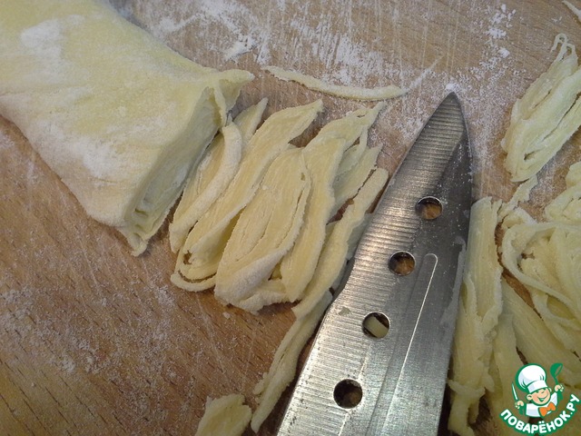 Далее тесто раскатываем очень тонко, посыпая мукой, складываем в рулончик и острым ножем нарезаем очень тонко. Лапша должна быть тонкой, а иначе - это макаронные изделия.