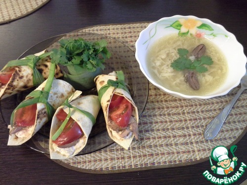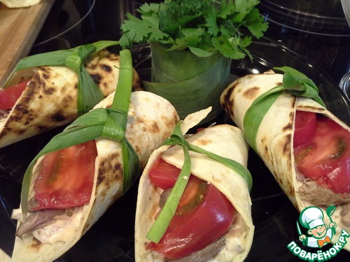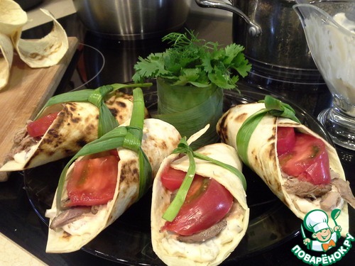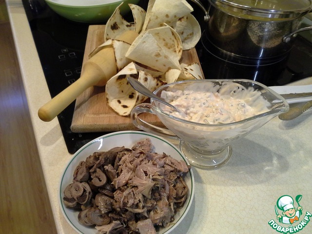 Займемся лепешками. Каждую лепешку разрезаем на 4 части и обжариваем быстро на сухой сковороде. Пока горячая, наворачиваем лепешку на скалку и держим до остывания, она получается лодочкой. Для соуса: смешиваем майонез, кетчуп, мелко нашинкованный лук-шалот и соленые огурцы.