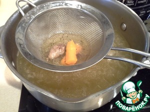 Как только бульон сварился, обязательно его процеживаем, мясо перебираем и отделяем от костей, если нужно, нарезаем.