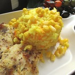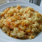 Добавьте к рису кукурузу, перец, карри. Все перемешайте и еще немного подержите на огне.