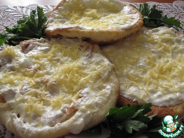 сметану смешать с измельчённым чесноком, добавить зелень и соль с перцем. Все тщательно перемешать. Твёрдый сыр отдельно натереть на терку. На каждую лепешку выложить немного приготовленного сметанного крема и посыпать тертым сыром. Сразу подать на стол.