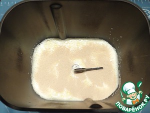 Тесто я замешиваю с помощью хлебопечки. В ведерко хлебопечки выливаю молочно-сырную смесь, добавляю сухие быстродействующие дрожжи, оставляю минут на 5-10.