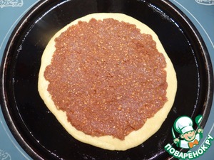 Начинку равномерно распределяю по поверхности круга из теста, немного отступая от края.