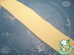 Беру чуть меньше половины оставшегося теста, с помощью муки для подпыла раскатываю длинную полоску теста толщиной примерно 0,5 см и длиной чуть меньше длины окружности из теста.