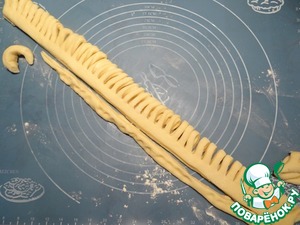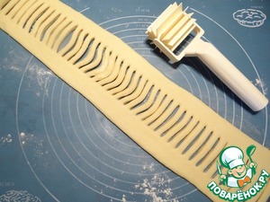 Затем беру половину оставшегося теста, снова с помощью муки для подпыла раскатываю полоску теста, с помощью валика делаю поперечные надрезы, снова складываю пополам, отрезаю лишнее тесто по краям, выкладываю второй круг "петелек".