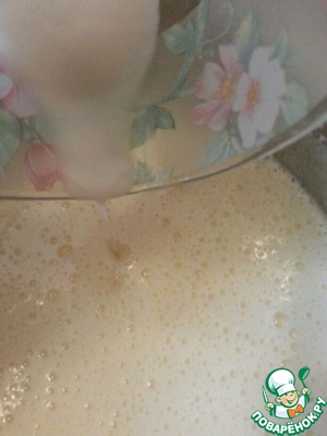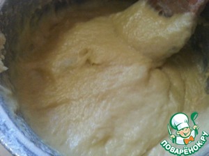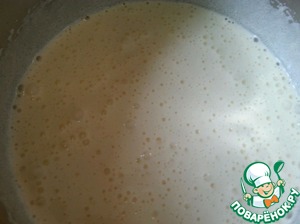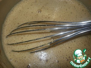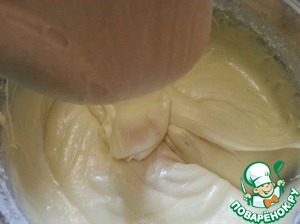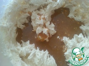 В взбитое мало добавляем по чу чуть остывшую, вареную смесь - сгущенки, меда, молока и коньяк. Взбиваем. Получается крем.