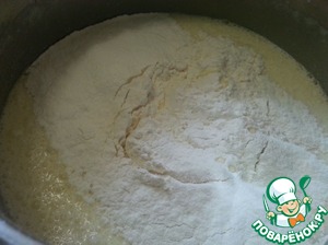 После бани, тесто минут 10-15 пусть остынет. Потом добавим оставшуюся часть муки.