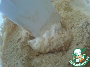 В готовый крем крошим маленький корж. Корж измельчаем в блендере или скалкой.