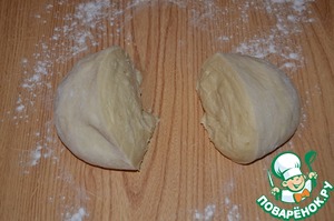 Когда тесто поднимется в третий раз, обмять его и разрезать на две части