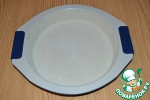 Смазываем форму диаметром примерно 25 см (моя оказалась маловата) сливочным маслом и посыпаем манкой. Думаю без манки тоже получилось бы нормально