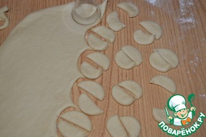 Вторую часть раскатываем и маленьким стаканчиком вырезаем кружки, которые разрезаем пополам