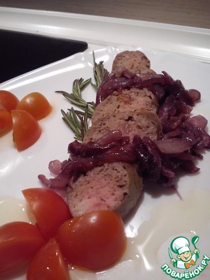 Красный лук нарезать четвертькольцами и обжарить. Когда лук стал прозрачным, добавить немного соли, перец, сахар и вино. Тушить на среднем огне до готовности, лук должен стать мягким, прозрачным и интенсивно золотистым.