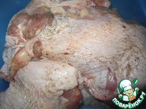 • Курицу вымойте, обсушите. Тщательно натрите солью и перцем.
