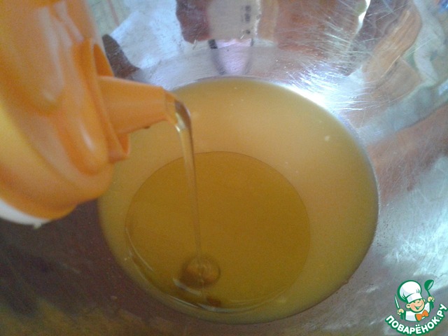 В чаше смешиваем апельсиновый сок, оливковое масло. |