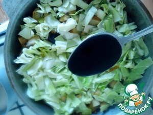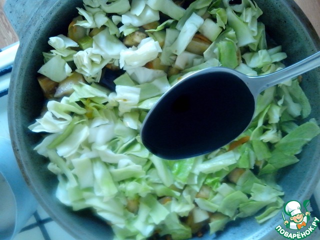 Когда баклажаны начнут пропитываться маслом (это сразу будет видно), засыпаем капусту и вливаем воду. Сразу же уменьшаем огонь до минимального и тушим 10 минут. На этом шаге мешать не надо. Необходимо дать капусте прогреться.