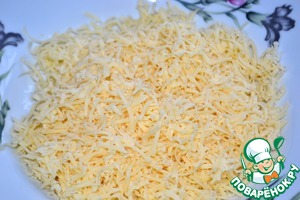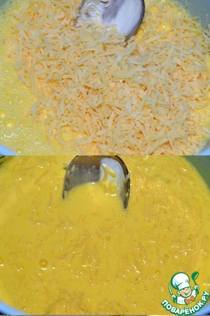 Готовим заливку: во взбитые яйца со сметаной добавляем натертый сыр и хорошо перемешиваем.