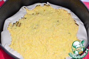 2/3 теста раскатать толщиной 5-7 мм и выложить в форму (диаметр 21 см) делая бортики (примерно около 3 см)