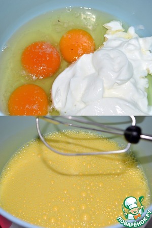 В чашу выложить яйца, сметану, добавить соль и хорошо взбить миксером (3-5 мин.)