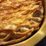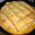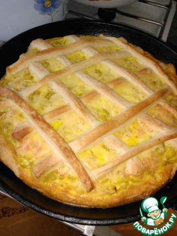 Из оставшегося теста с помощью специального ролика сделать сеточку. Если ролика нет, то сделать полоски теста и выложить на верх пирога. Смазать верх пирога взбитым яйцом.