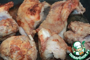 Кролика режим на порционные кусочки, моем и обсушиваем салфеткой. На небольшом количестве оливкового масла обжариваем до румяной корочки нашего кролика, предварительно обваляв его в муке.