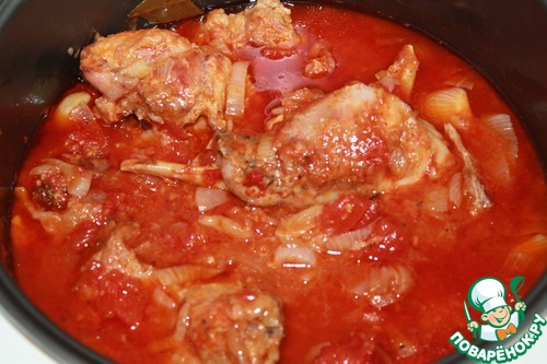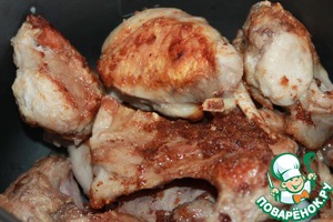Перекладываем нашего кролика в чашу мультиварки. Туда же отправляем масло на котором он обжаривался.