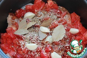 Затем в нескольких местах по чуть чуть выкладываем томатную пасту. Можно ее и не добавлять, я добавила для цвета. Далее добавляем, смесь белых кореньев с укропом, орегано, перец молотый, лавровый лист. Солим. Можете добавить любимые вами приправы к мясу. Еще добавляют гвоздику и немного корицы, но мне такой вкус не по душе. Сверху целыми кладем зубчики чеснока.