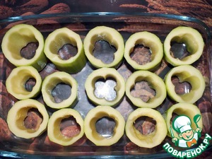 Выложить кабачковые колечки в смазанную растительным маслом форму, начинить грибной начинкой. Можно добавить немного воды для сочности. Я не добавляла, просто закрыла форму крышкой.