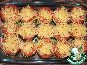 Сыр натереть на мелкой терке, помидор нарезать колечками. Кабачковые колечки посыпать сыром, затем положить по дольке помидора, сверху опять засыпать тертым сыром