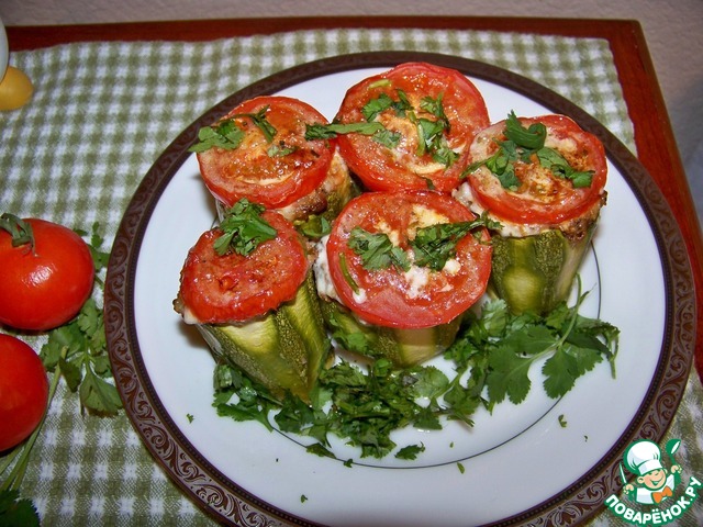 Запекать в горячей духовке при 200*С до готовности (около 40 минут). Готовые кабачки украсить зеленью.
