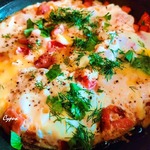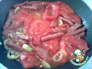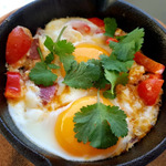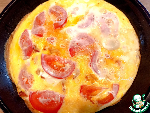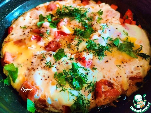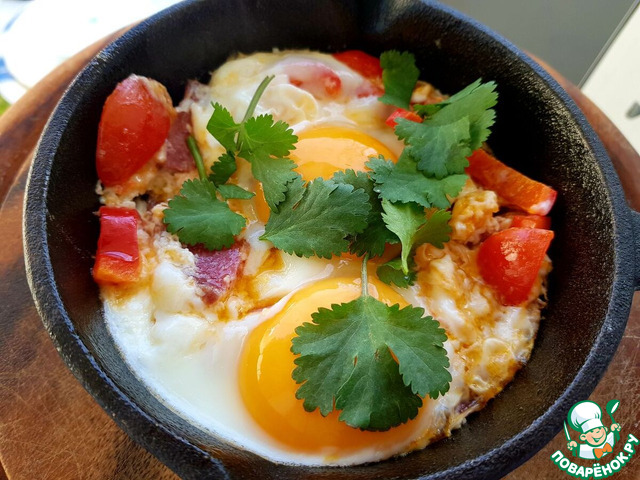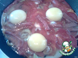 Сверху вбить 3 яичка, посолить, поперчить, довести до готовности.