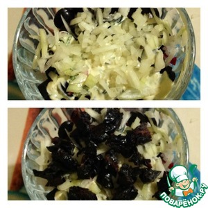 • Мелко порезать репчатый лук, далее слой чернослива порезанного мелким кубиком ( предварительно замачивать не надо)
