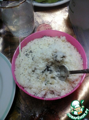 • Посыпать грецкими орехами пропущенными через скалку, натереть сыр на мелкой терке. Поперчить, добавить кунжут и мак.