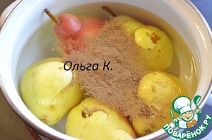 Нужно подготовить груши: помыть, положить в кастрюльку и залить водой, так чтоб вода их полностью покрывала. Добавить в воду мед, столько чтоб вам было сладко, 2 чайных ложки корицы "Haas"и отварить груши до полной готовности. Достать из сиропа и остудить. Сам сироп не выливать.
