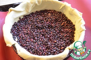 Раскатать слоеное тесто и выложить в разъемную форму для запекания, дно у формы я убрала и поставила на силиконовый коврик. На дно теста нужно выложить груз, чтоб тесто не вздулось ( у меня 1 упаковка фасоли, так как у меня оказывается неожиданно закончилась бумага для запекания и фольга, то мне пришлось фасоль засыпать без бумаги и фольги), уж простите. Края теста загибайте как Вам угодно, но чтоб они хрошо были придавлены к бортикам, иначе тесто может съехать вниз. Выпекать в разогретой духовке до 180 градусов 15 минут-20 минут. Тестовую основу остудить, переложить прям вместе с разъемным кольцом на тарелку, в которой у Вас будет пирог-десерт.