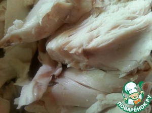 Курицу освобождаем от костей и добавляем в бульон. Варим 10 - 15 минут.
