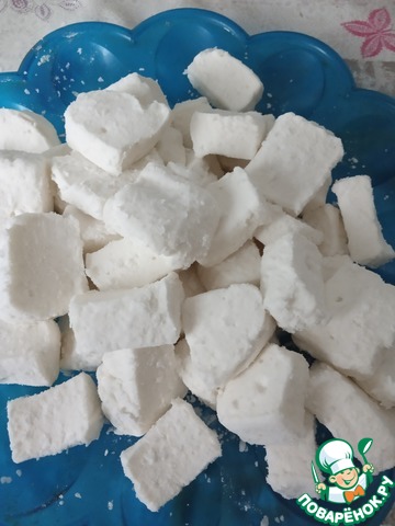 Затем я застелила форму пищевой пленкой и чуть смазала раст. маслом без запаха (иначе потом сложно отделить маршмеллоу), выложила нашу смесь и сверху также закрыла пленкой, смазанной маслом. Отправляем в холодильник до полного застывания и используем в мастику. Если вы хотите маршмеллоу съесть, то смешайте 0,5 стакана сахарной пудры и 0,5 стакана крахмала в миске, разрезайте на кусочки (это лучше делать острым ножом) и обваливайте в смеси.