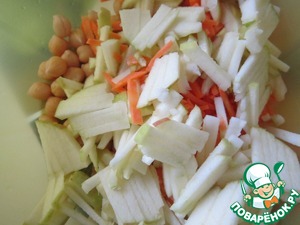 Морковь и яблоки нарезать соломкой. Добавить в чашку с нутом.