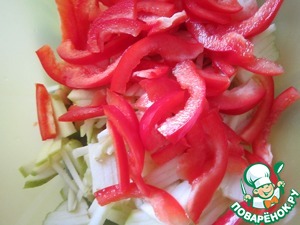 Болгарский перец порезать соломкой. Добавить к остальным ингредиентам.