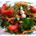 Яркий, витаминный, сочный, легкий салат! А еще он невероятно вкусный и полезный! Никогда бы не подумала, что салат с нутом может быть вкусен, если бы не попробовала. Теперь готовлю этот салат довольно часто. Тем более, что нут - это богатый белком, низкокалорийный продукт.