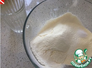 В отдельной посуде смешиваем просеянную муку, манку, соль. Если вместо соды Вы пользуетесь разрыхлителем, то его добавляем тоже. На фото видно, что я пользуюсь обычным советским граненым стаканом.