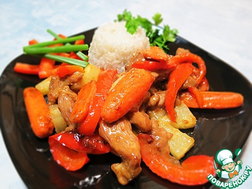 Свининка в кисло-сладком соусе со сладким перцем, морковкой и ананасом. Приготовление мяса в особом маринаде кардинально поменяло его вкус, он стал необычным для свинины, более нежным и легким. Овощи тоже порадовали благодаря быстрому приготовлению и сочетанию со сладким ананасом. Под видео описание приготовления.