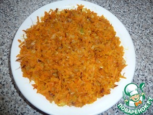 Натираем на терке свежую морковку, режем мелко лук и обжариваем на подсолнечном масле до золотистого цвета (как для бульона).