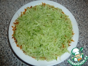 Натираем огурцы на крупной терке и укладываем тонким слоем на обжарку.