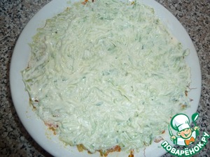 Добавляем в майонез соль, перемешиваем. Смазываем слой с огурцами.